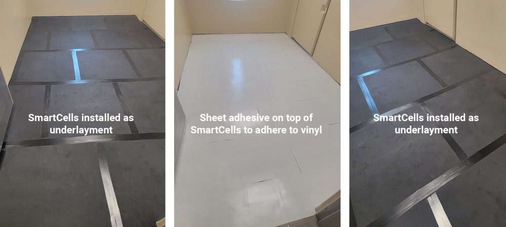 SmartCells 3’x3′ tiles are installed under sheet adhesive. The sheet adhesive is used to adhere to the vinyl flooring
