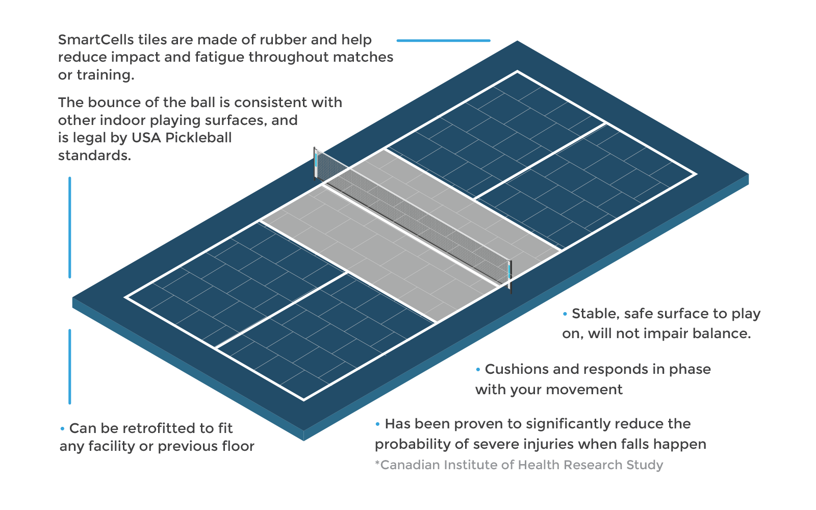 The SmartCells Pickleball Safety court provides a cushioned but stable surface that absorbs up to 90% of impact forces in the event of a fall. This drastically reduces the chances of serious injuries.